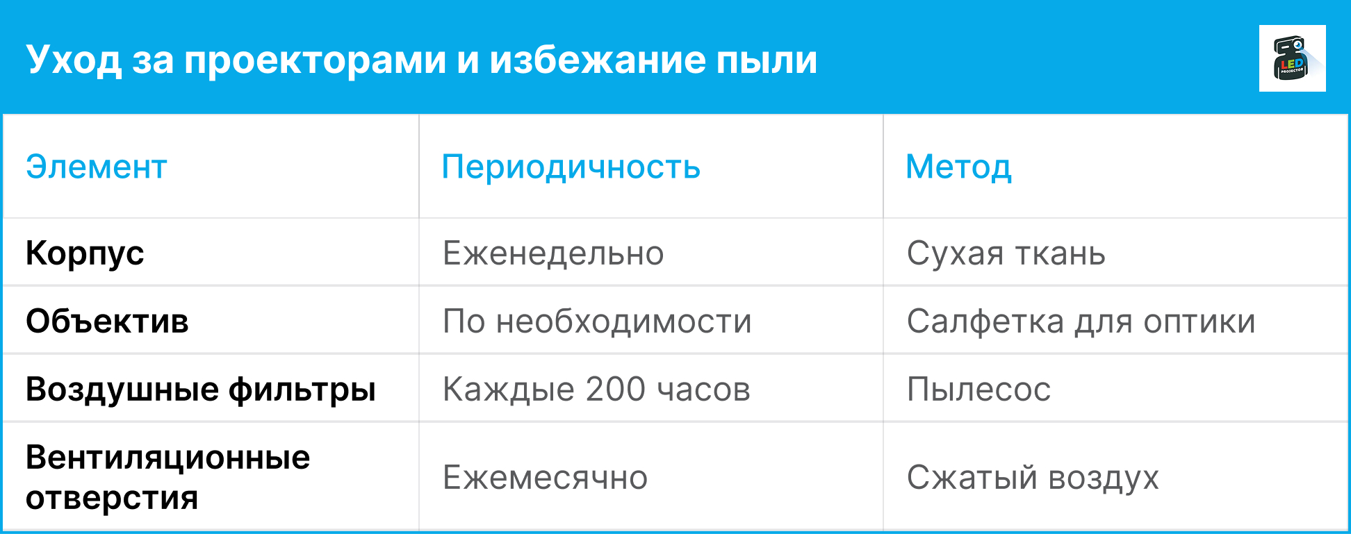 Пыль оседает на оптике, ухудшая яркость и четкость. Она также забивает системы охлаждения. Регулярно протирайте корпус сухой мягкой тканью и очищайте воздушные фильтры.